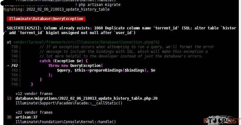 SQLSTATE[42S21]: Column already exists: 1060 Duplicate column name 'torrent_id' (SQL: alter table `history` add `torrent_id` bigint unsigned not null after `user_id`)